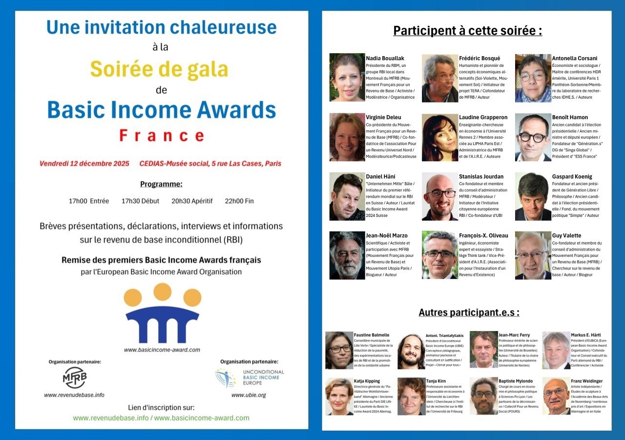 Am Freitag, den 12. Dezember 2025 werden in Paris zum ersten Mal die "Basic Income Awards" in Frankreich verliehen!